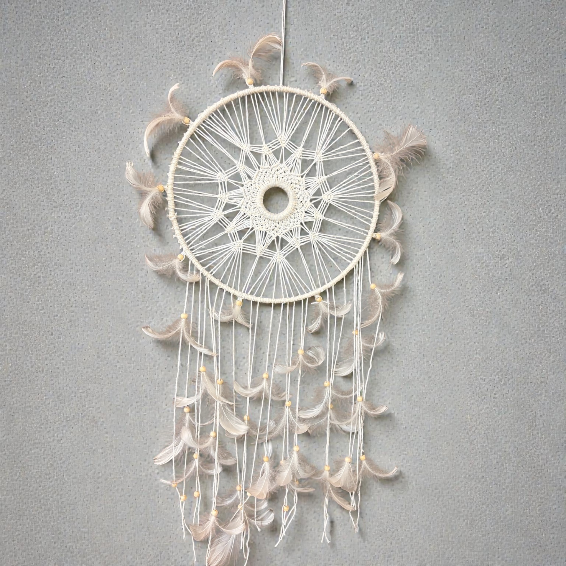 Velký jemný lapač snů doplněný bílým peřím a dřevěnými korálky.