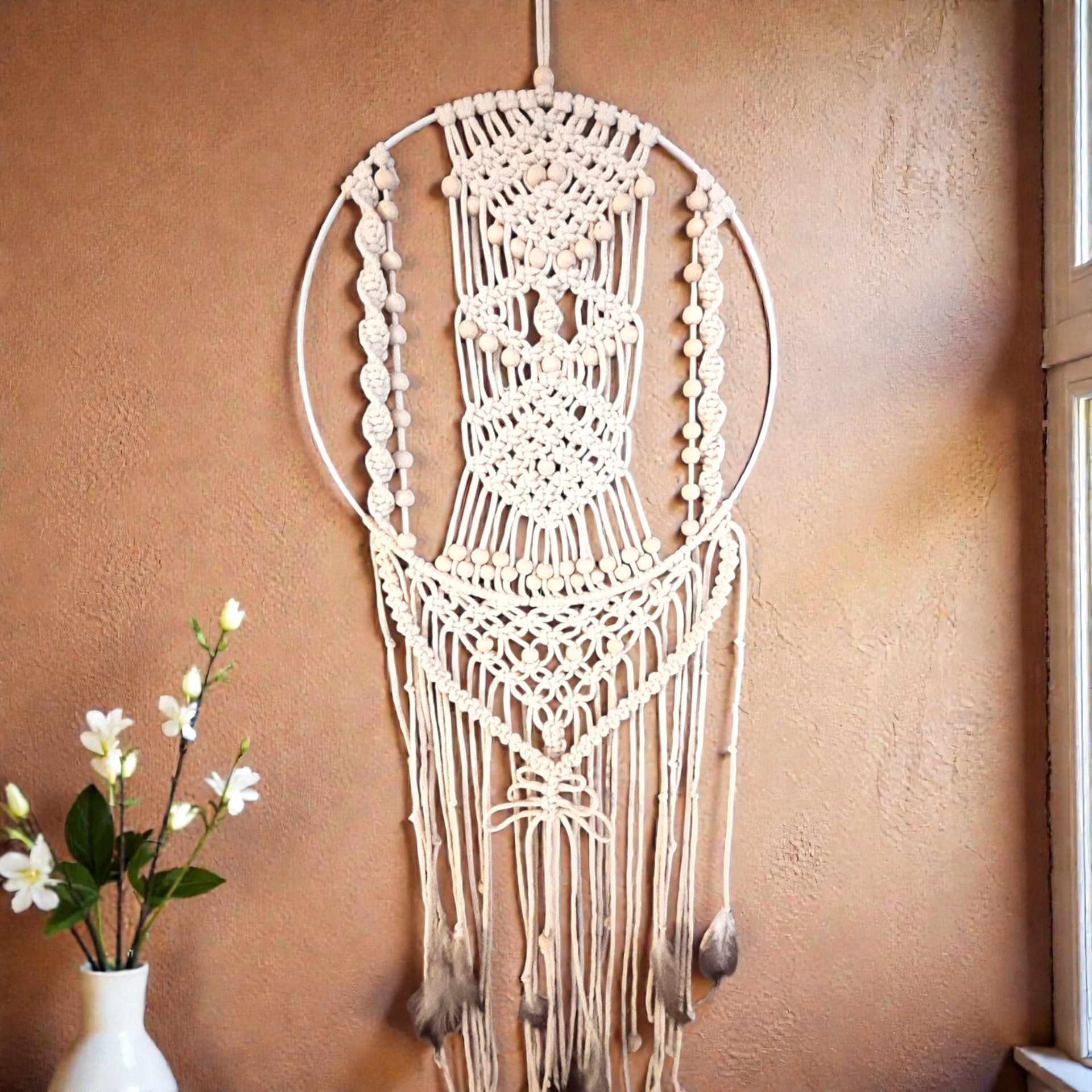 Lapač snů v přírodní zemité barvě, doplněný dřevěnými korálky a peřím. Uklidňující kousek do Vašeho interiéru.